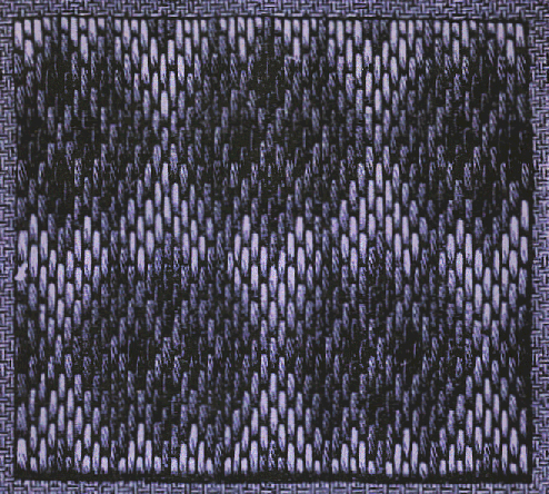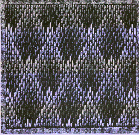 Les lignes obliques, qui croisent tout le dessin et qui sertissent les losanges en noir, sont brodées en rouge ; les triangles,qui touchent aux losanges, sont travaillés en trois verts, le fond en blanc-ivoire. Tous les points sont à poser verticalement par-dessus quatre fils du tissu.