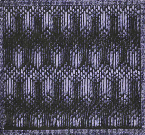 Les lignes foncées, qui forment le contour des figures, sont à broder en noir, avec des points lancés verticalement par-dessus quatre fils du tissu. Le remplissage des figures se fait alternativement avec quatre nuances de brun et quatres nuances de bleu. |