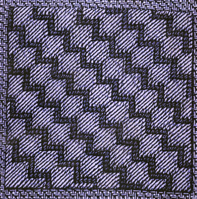 On commence par les lignes foncées en zigzag au petit point par dessus un fil de tissu. Lorsque les lignes foncées sont terminées, on remplit le fond de points plats obliques, dont le plus petit s'étend sur duex fils, le plus long sur six fils du tissu.