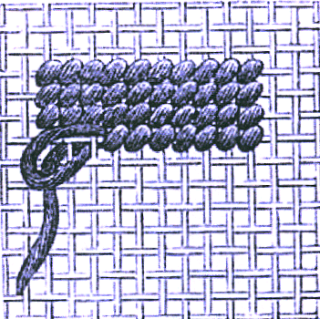 Ce point n'est autre chose que le premier point du point de croix, exécuté par dessus un seul fil. L'image montre un retour de droite à gauche. Si les points doivent être très uniformes, il faut faire avancer le fil sur l'envers de deux fils de canevas.