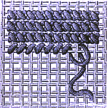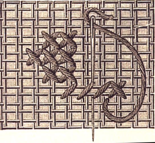 Dans l'aller on lance un fil en sens oblique, de gauche à droite, par-dessus un fil double du canevas, puis on fait passer l'aiguille verticalement sous un fil double transversal. Dans le retour, on fait le même point de droite à gauche ; ces fils croisés forment le point de croix.