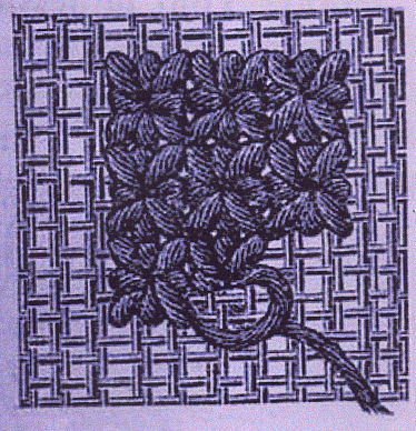 On commence par un point oblique par-dessus un fil double, en descendant de droite à gauche, on monte verticalement sous le fil double, puis on exécute un point vertical sur l'endroit de l'ouvrage, ensuite on fait suivre un point oblique venant de gauche, puis un point horizontal et ainsi de suite jusqu'à ce que l'étoile soit terminée. Pour arriver à des étoiles bien régulières, il convient de les travailler en rangs horizontaux et de commencer chaque groupe de points dans le même direction.