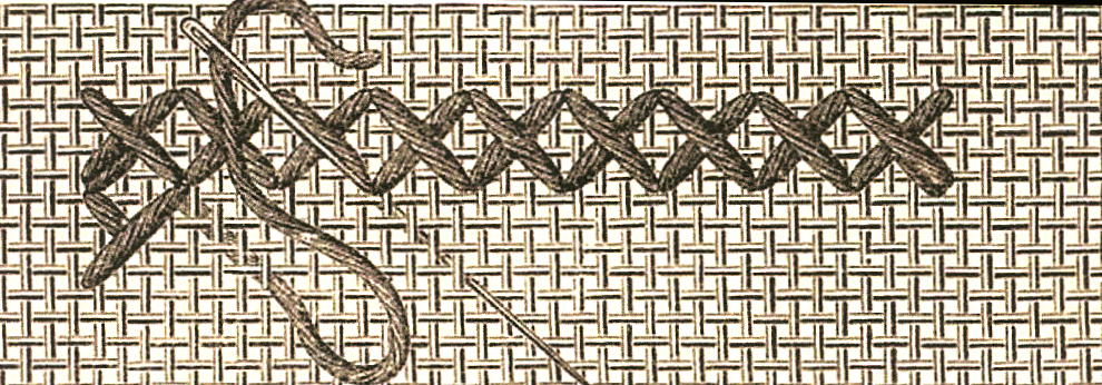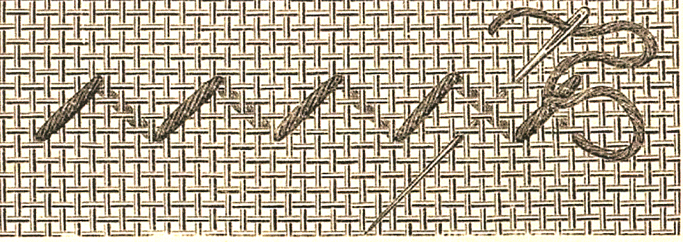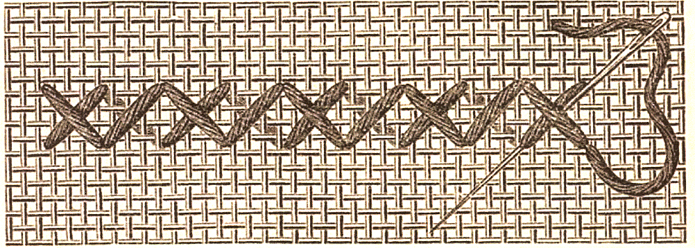 Pour exécuter un dessin réservé au point de croix à double face, on le travaille enfiles de lignes droites, en deux allers et retours . En allant de gauche à droite, on introduit le fil sans y faire de noeuds ; on fait quelques petits points, qui sont recouverts ensuite par la première moitié du premier point. On passe toujours l'aiguille, en la dirigeant vers la droite, par-dessus quatre fils de tissu ou canevas dans le sens de la hauteur et de la largeur, jusqu'au bout de la file de points. Arrivé au dernier point, on ramène le fil jusqu'au milieu de ce dernier point, d'où on le fait sortir, pmuis avec u point auxiliaire vers la droite, on revient vers le milieu pour faire rentrer l'aiguille au dessus de deux fils et on passe au deuxième tour, qui va de droite à gauche et qui termine les points commencés dans le premier aller. Souvent, les deux points auciliaires sont recouverts d'un point long, comme l'indiquent les figures 2 et 3. Après le dernier point du premier retour, on ramène de nouveau le fil vers la droite pour le dexième aller, lequel comble par une demi-croix les vides laissés par les deux premiers tours de points.
