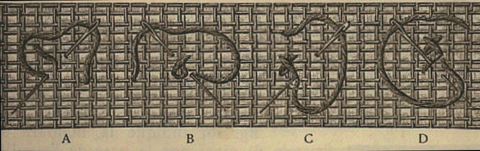 Dans la fig 4 le détail A indique le point d'entrée du fil dans l'étoffe et la position de l'aiguille pour le premier point ; le détail B, le premier demi-point de croix terminé, avec un point auxiliaire vers la droite, la sortie du fil à droite et la pose de l'aiguille pour le troisième point, terminant la croix ; le détail C montre, à l'état achevé, le point commencé en B et la pose de l'aiguille por arriver à un point vers la droite ; le détail D, un point de croix terminé et le commencement d'un autre point placé dessous.