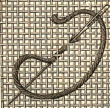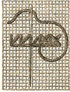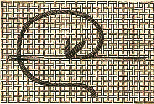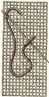 Pour faire un rang final, on fait passer l'aiguille de gauche à droite par-dessous et par-dessus les fils du fond sortant du dernier point de croix, avant de la faire passer sous le point vertical indiqué dans la fig 4. Ce pooint de broderie, exécuté sur un tissu à fils espacés, produit un effet de transparence de splus heureux, seulement, il faut assez fortement tirer son fil en travaillant.