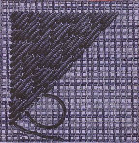 Ce joli fond est produit par de petits triangles composés de quatre points et opposés les uns aux autres. Dans le premier tour oblique, on fait en descendant un arrière point alternativement par-dessus un et par-dessus quatre croisements de canevas, dans le second rang, on fait en remontant un arrière-point par-dessus trois et deux croisements de canevas, dans le troisième rang en descendant , par dessus trois et deux croisements de canevas, dans le quatrième rang en remontant par-dessus un et quatre croisements de canevas. Les points longs du rang suivant sont posés devant le petit point et le petit point devant le point long du dernier rang.