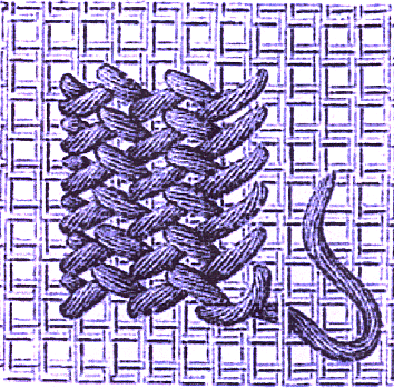 C'est un point qui demande à être exécuté avec une certaine attention lorsque l'on veut le faire en allers et retours. Si l'on n'était pas disposé à y consacrer une application suffisante, il vaudrait mieux ramener le fil à chaque fois au point de départ. On conduit le fil par-dessus quate fils en largeur et deux fils en hauteur vers le bas, et sur l'envers, de droite à gauche, sous deux fils, comme l'indique , du reste, l'image.