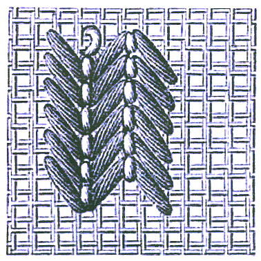 On oblique le point par-dessus deux ou quatre fils dans le sens de la hauteur et de la largeur et on le ramène sous un ou deux fils au-dessus du point de départ du premier point. Le second rang de points est à exécuter dans le sens contraire, puis les rangs terminés, on ajoute, entre deux rangs de points, une file d'arrière-points en une couleur différente.