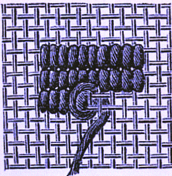 Ce point est toujours travaillé en rangs horizontaux. On lance le fil en sens vertical par-dessus deux fils du tissu et on laisse chaque fois un fil du tissu entre les points.