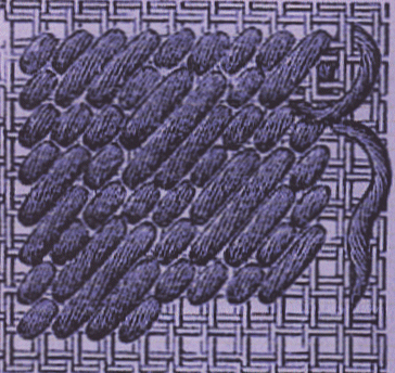 Au lieu de sertir sur les quatre cotés les carrés, on les fait suivre en ligne oblique non interrompue, de sorte que les points forment des marches. Des demi-points de croix, par dessus un fil double, séparent les lignes de carrés.