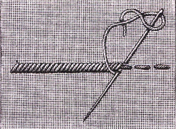 Le cordonnet oblique se fait également de gauche à droite par-dessus un tracé simple. On introduit l'aiguille au-d"essus du tracé et on la fait ressortir sous le tracé. Lorsqu'il s'agit de faire des lignes très fines et très délicates, l'aiguille ne doit relever que les fils qui se trouvent sous le tracé.