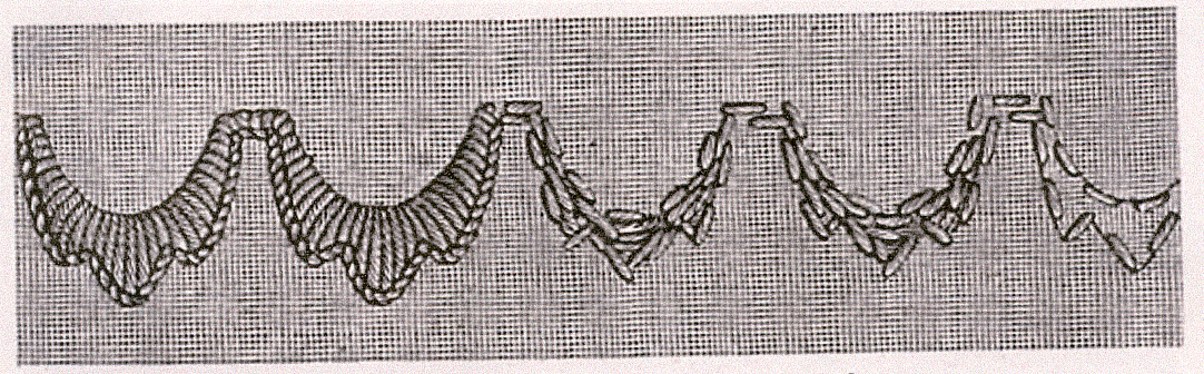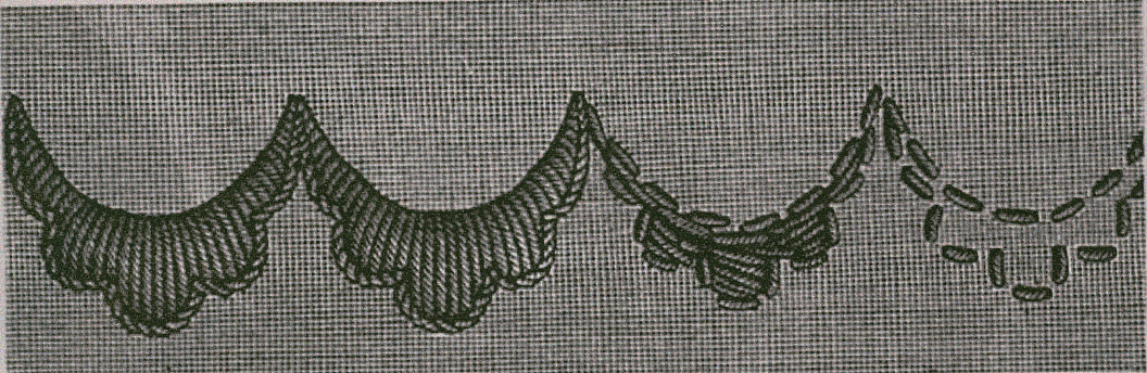 On appelle ainsi de gands festons composés de plusieurs petits festons ronds ou pointus. La premiére image nous montre une série de festons de roses à dents arrondies, la deuxième, une série de festons de roses à dents pointus, réunis dans le haut, les uns au autres, par une bride droite.