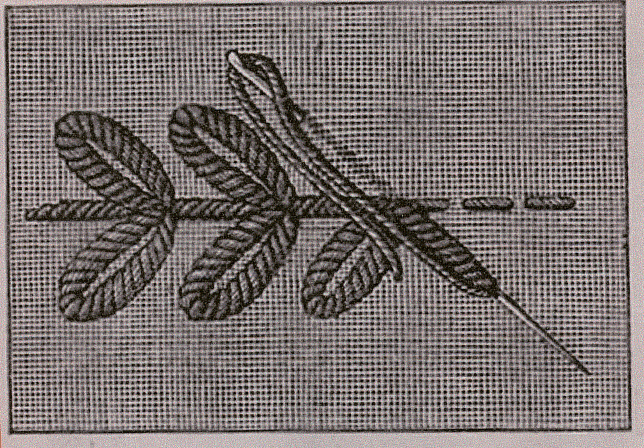 On fait entrer l'aiguille à l'extrémité de la feuille, puis on la conduit sous l'étoffe vers la tige où on la fait sortir jusqu'à la moitié de sa longueur. On met le pouce de la main gauche sur le chas de l'aiguille et, de la main droite on tourne le fil autour de la pointe de l'aiguille aussi souvent qu'il est nécessaire pour couvrir l'espace sous lequel elle a passé. Puis on avance le pouce gauche sur les spirales ainsi formées, au travers desquelles on fair passer l'aiguille et le reste de l'aiguillée, on ramène la pointe de l'aiguille vers le bout de la feuille et on la fait ressortir à la place indiquée pour le point suivant.